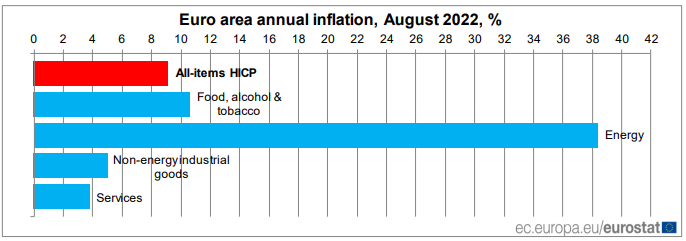 据欧盟统计局当地时间8月31日公布的初步统计数据,欧元区19国今年8月通胀率为9.1%,高于上月的8.9%。
