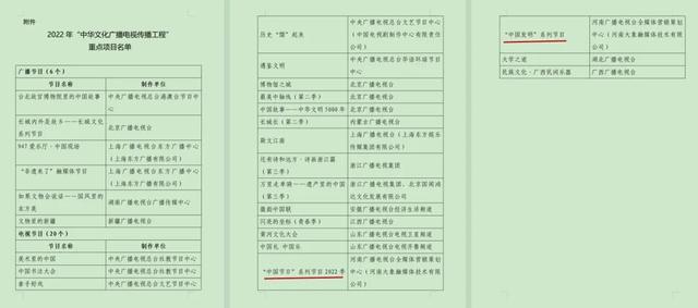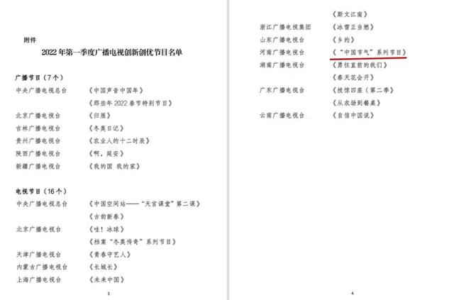 河南广播电视台制作的《“中国节气”系列节目》,成功入选2022年第一季度广播电视创新创优节目名单。《“中国节日”系列节目2022季》《“中国发明”系列节目》入选2022年“中华文化广播电视传播工程”重点项目。