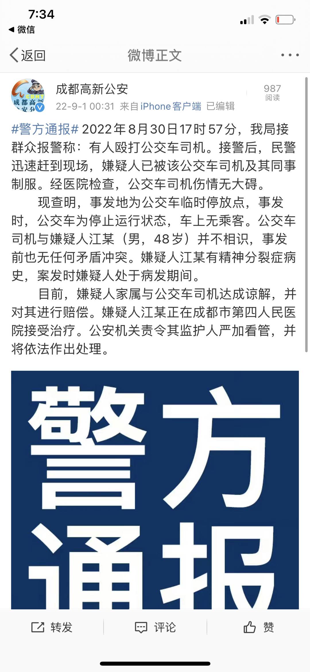 9月1日凌晨,成都市公安局高新公安分局发布警方通报称:2022年8月30日17时57分,警方接群众报警称,有人殴打公交车司机。接警后,民警迅速赶到现场,嫌疑人已被该公交车司机及其同事制服。经医院检查,公交车司机伤情无大碍。