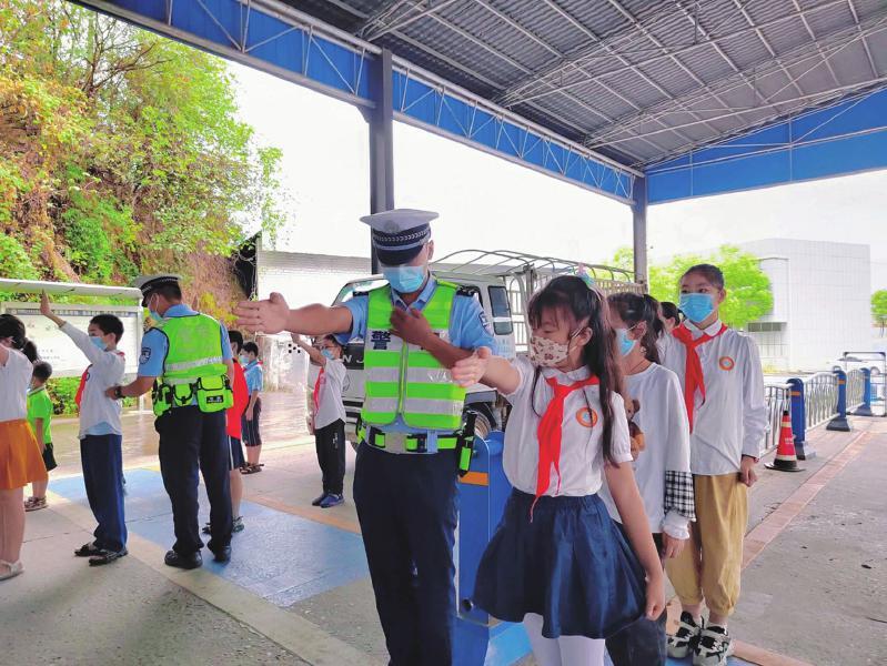 图为8月30日的活动中,民警带领孩子们学习交通指挥手势操