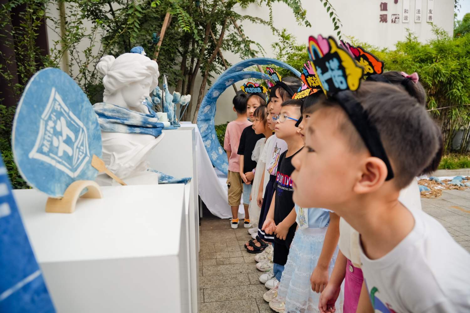 孩子们和爸爸妈妈一起走上红毯,跨越“龙门”。从此刻开始,红毯上“六大养成教育目标”,将成为孩子们今后六年行动的标尺。运河校区一幅幅蓝染作品呈现在孩子们眼前,小校园“大文化”,江南古韵的校园建筑风格和蓝染文化的结合使校园处处都有教育功能,时时都有教育机会。