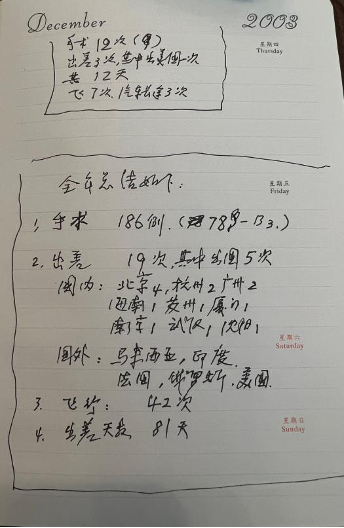 吴孟超在日记中记下的全年工作量总结。新华社记者 袁全 摄