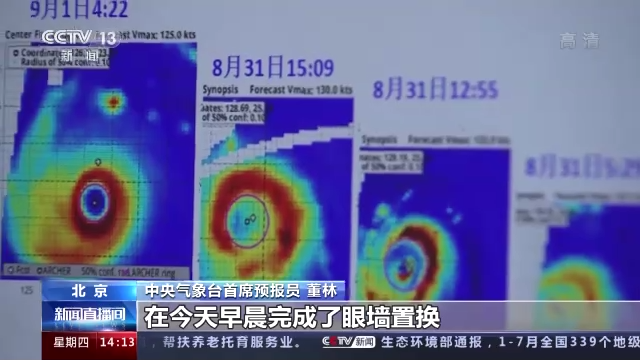 中央气象台首席预报员 董林:所谓的眼墙置换就是台风眼的周边有一个很强的风区,就像一堵墙一样,我们管它叫眼墙。但是当台风维持了一段时间很强的强度之后,它就会有眼墙的破坏,再重新生成的过程。所以从昨天到今天的一段时间之内,它略有减弱,在今天早晨完成了眼墙置换,并且第二次的眼墙有可能比之前那次还要稍微强一点,所以目前它的强度又达到了一个峰值。我们今天早晨把它的强度定到了17以上,也就是65秒米左右。