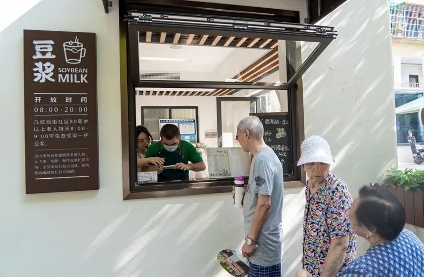 每天上午,浙江省衢州市区上街仁德路6号小屋窗前总会排起长队——8点至9点,小店所处社区80周岁以上老人,都可以来这里免费领取一杯豆浆。小店的招牌上,还写着这样一段小字:店内服务员都是特殊关爱人群,从点单、结账、制作豆浆和茶点等,全部由他们独立完成。