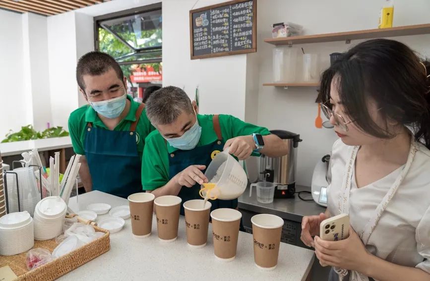 说起儿子的变化,小吴的父亲满是欣慰:“儿子以前在家什么活都不会干,几乎不说话。现在,每天回来都会和我分享今天卖了几杯豆浆,学会了收银、又学会了磨豆浆,很有成就感,‘残疾人之家’真的帮助了我们一家。”