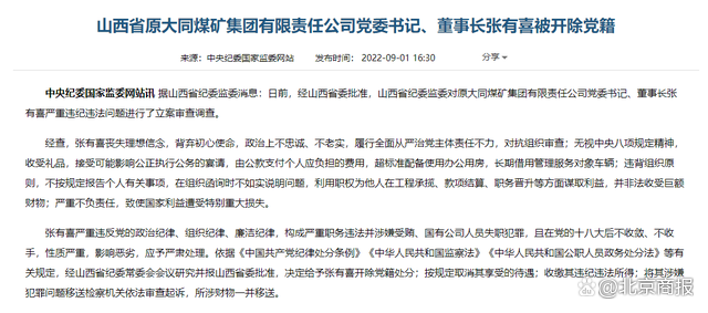 中央纪委国家监委网站讯据山西省纪委监委消息:日前,经山西省委批准,山西省纪委监委对原大同煤矿集团有限责任公司党委书记、董事长张有喜严重违纪违法问题进行了立案审查调查。