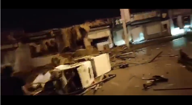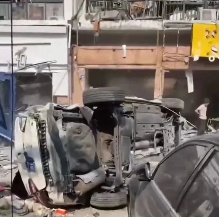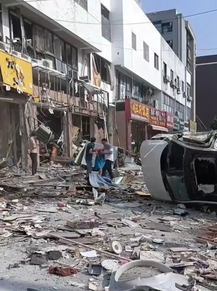 事故现场一片狼藉,多个沿街店铺门窗均被损坏,砖块、门板等碎片七零八落,2楼门窗也一定程度上被损坏,周边有车辆受到波及侧翻在地。