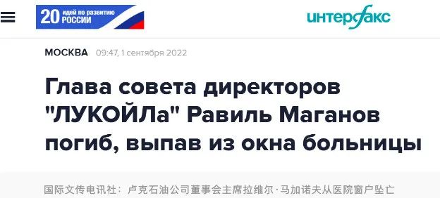 综合《消息报》、国际文传电讯社等多家俄媒9月1日报道,俄罗斯卢克石油公司董事会主席拉维尔·马加诺夫当天在莫斯科中央临床医院坠亡。报道称,相关部门正在调查他的死因。