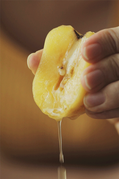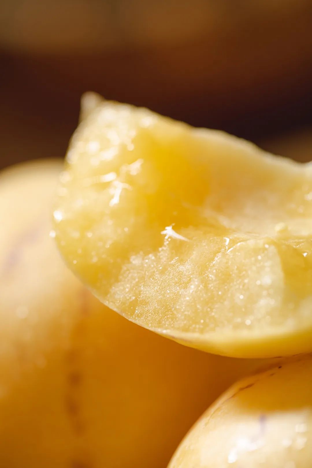 拿一颗在手里,细嗅能闻到独特的清香;圆滚滚一个,外皮泛黄,紫色的花纹点缀其中,十分可爱;剥开后的果肉更是诱人,近乎金黄色的容颜,一口爆汁,清甜甘洌,仿佛整个秋天的干燥都被赶走。