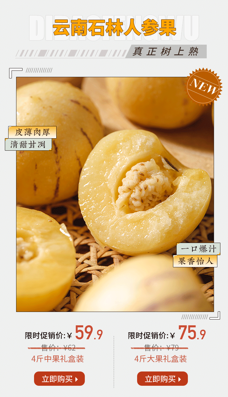 云南石林的人参果的成熟期是在8月下旬至10月,现在正是人参果赏味巅峰的开始,4斤中果礼盒装不到60块,无论是自吃还是送礼都很合适。今年中秋,就用这箱来自云南的人参果,向家人朋友送去一份健康和美味吧!