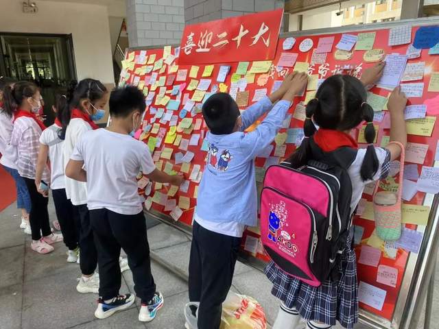 开学第一天,常春藤附属小学的“红孩子”们在入校时,将一张张写满心愿和志向的小纸条贴上了心愿墙,用一句句梦想和志向为党的二十大献礼!