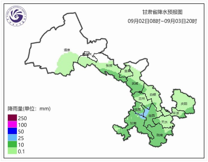 9月1日夜间至9月2日白天:甘南、临夏两州及定西市西部多云转阴,部分地方有小雨,局部地方有中雨;张掖、金昌、武威三市多云转阴,部分地方有小雨或阵雨;省内其余地方多云。