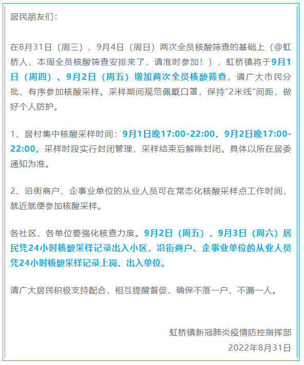 闵行区虹桥镇发布公告:在8月31日(周三)、9月4日(周日)两次全员核酸筛查的基础上,虹桥镇将于9月1日(周四)、9月2日(周五)增加两次全员核酸筛查。居村集中核酸采样时间:9月1日晚17:00-22:00、9月2日晚17:00-22:00。采样时段实行封闭管理,采样结束后解除封闭。具体以所在居委通知为准。(相关报道)