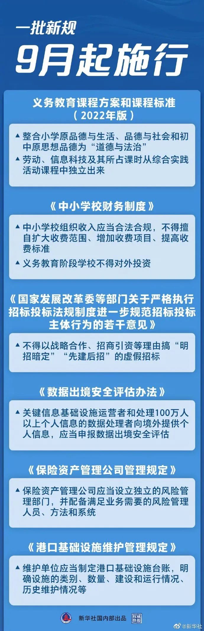 2022年9月一批新规开始施行:义务教育教学内容与方式迎来重要变化,劳动、信息科技及其所占课时将从综合实践活动课程中独立出来;中小学校财务行为进一步规范,中小学校严禁设立“小金库”、严禁公款私存;招标投标新规严禁虚假招标、违法投标和不诚信履约行为等。