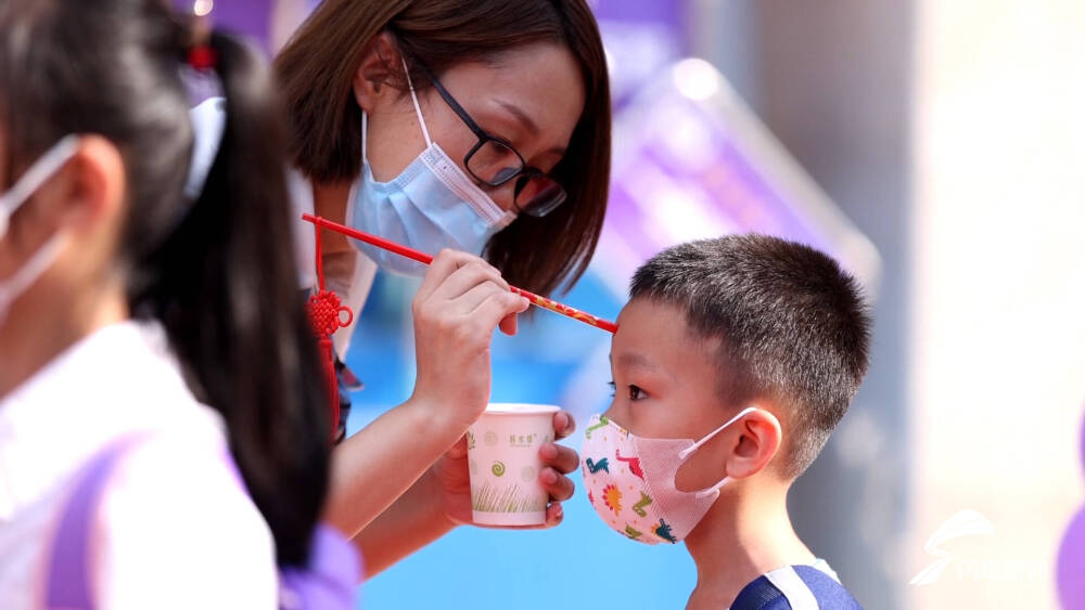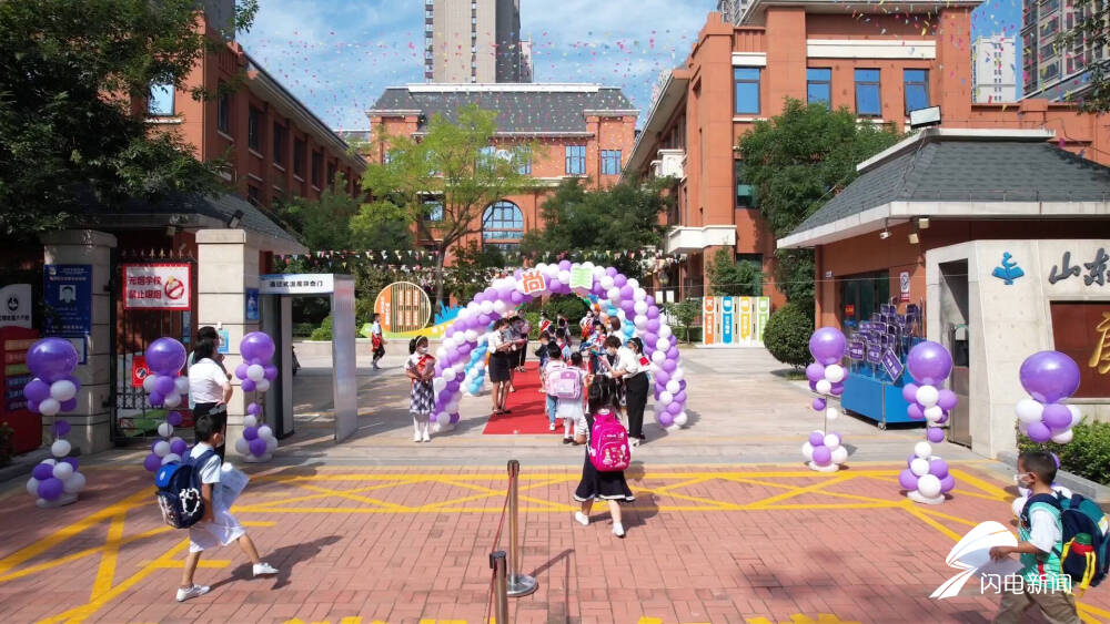 记者在德州市康博小学门前看到,开学第一天,该校为一年级的新生们准备了开学花束,孩子们走过红地毯,穿过象征着尚美、博学、健康、高雅的四道彩虹门,正式开启求学之旅。老师还为每位新同学准备了朱砂启智的仪式,小小红痣寓意开启智慧,饱含着老师们的美好祝愿。