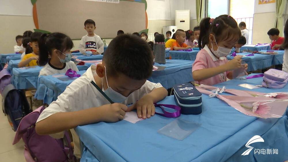 在教室里,该校的290余名新生领到了学生卡,并动手写上自己的名字。孩子们还收到了特殊的开学礼物——一根棒棒糖和一根跳绳。
