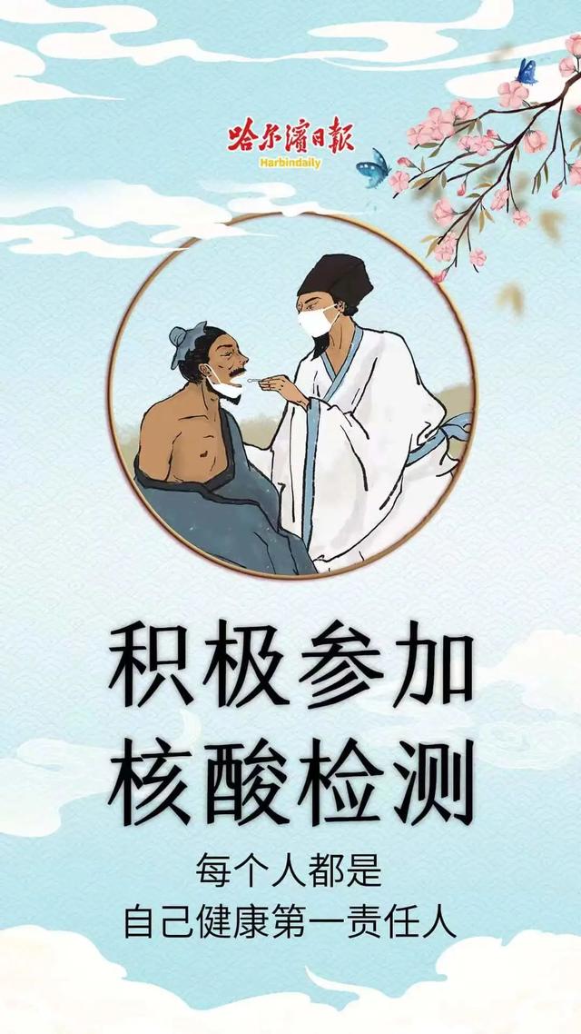 积极参加核酸检测。近日,我市正在组织开展区域核酸检测,当日完成、不落一人。请广大市民积极参加核酸检测,并自觉服从现场管理,全程做好个人防护。对未按规定时限要求参加区域核酸检测的人员“龙江健康码”赋黄码,出现阳性病例且造成严重后果的将依法严肃追究责任。