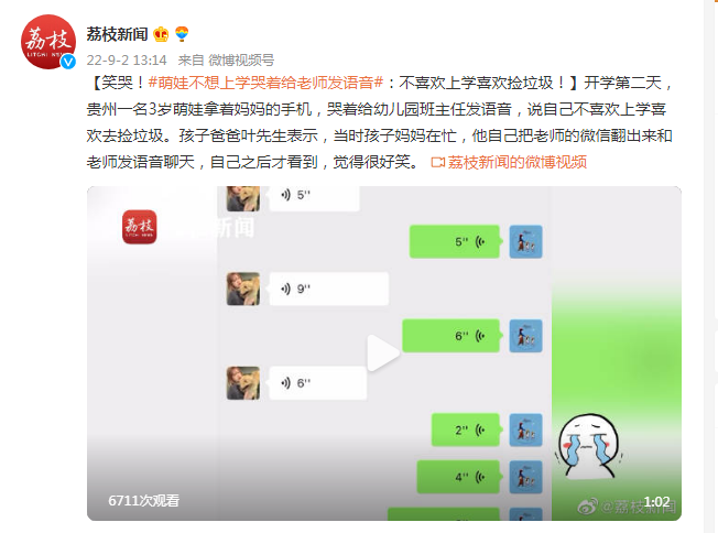 【笑哭!#萌娃不想上学哭着给老师发语音#:不喜欢上学喜欢捡垃圾!】开学第二天,贵州一名3岁萌娃拿着妈妈的手机,哭着给幼儿园班主任发语音,说自己不喜欢上学喜欢去捡垃圾。孩子爸爸叶先生表示,当时孩子妈妈在忙,他自己把老师的微信翻出来和老师发语音聊天,自己之后才看到,觉得很好笑。