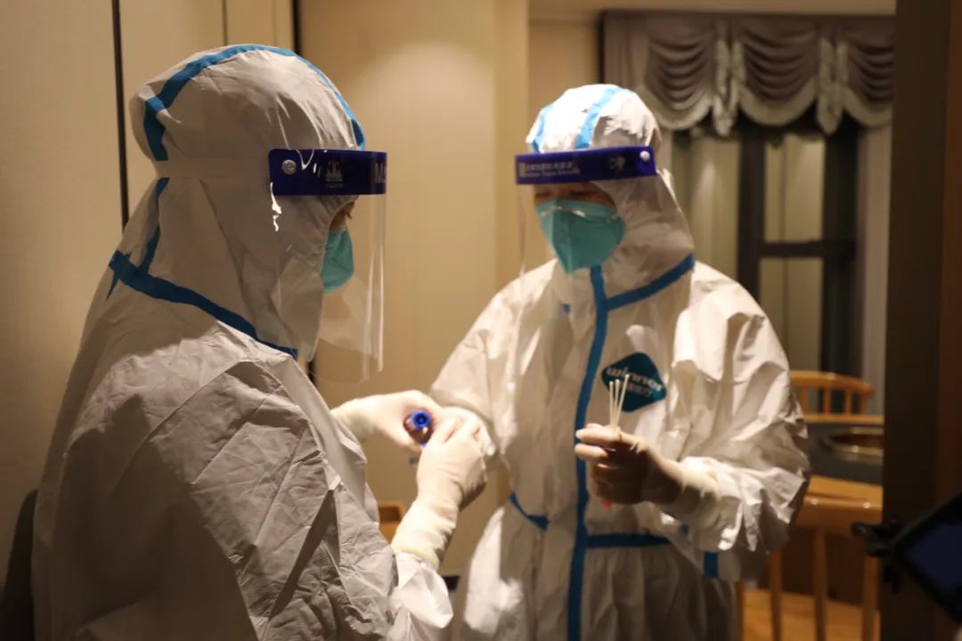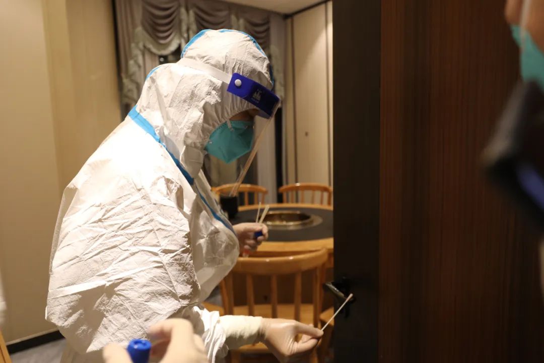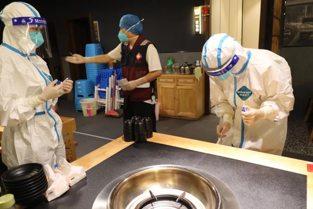 在市城区一家火锅店,流调人员全副武装采样现场标本。