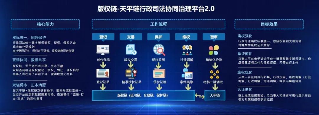 围绕这些版权治理问题,北京互联网法院与北京版权保护中心携手打造了版权链-天平链协同治理平台。