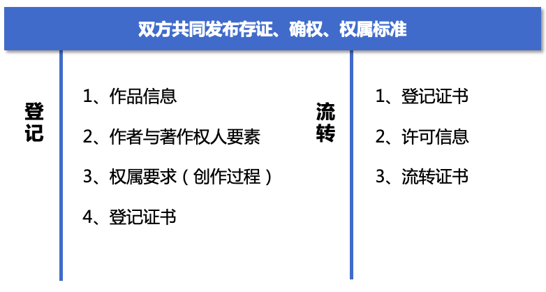 由司法输出标准,统一版权链、天平链在确权、授权、维权等环节存证的标准和规则,提升电子证据认定的效率和质量。特别针对版权交易授权精确到单次、单个权益,且版权转让交易过程全程双链存证留痕、可追溯。