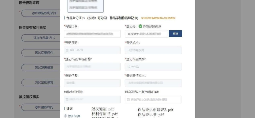 目前,版权链共发放数字版权证书300余万张。在诉讼时,当事人可在北京互联网法院电子诉讼平台一键拉取版权链已登记的作品相关材料。