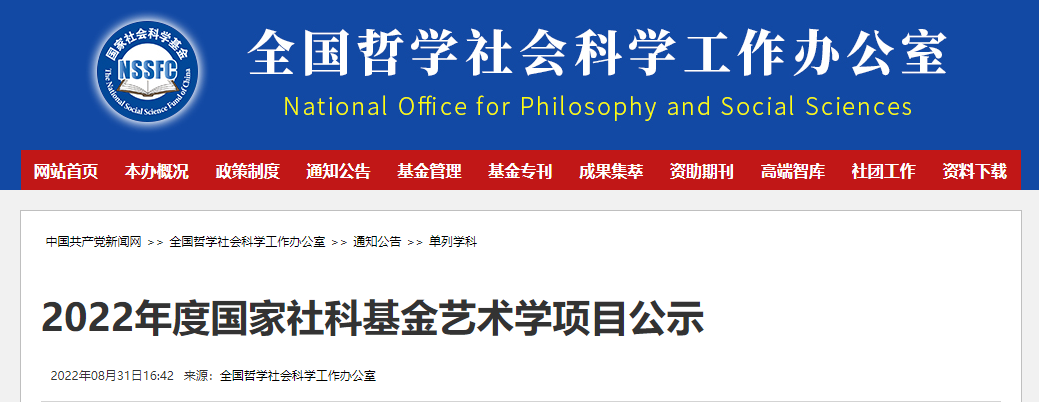 8月31日,全国哲学社会科学工作办公室发布了2022年度国家社科基金艺术学项目公示。