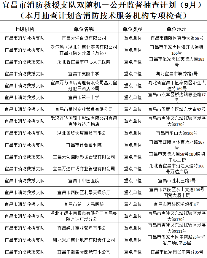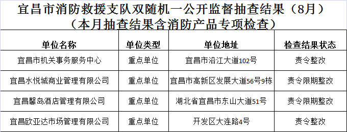 现将2022年9月宜昌市消防救援支队“双随机一公开”监督系统随机生成的抽查单位及2022年8月“双随机一公开”监督抽查结果予以公示。