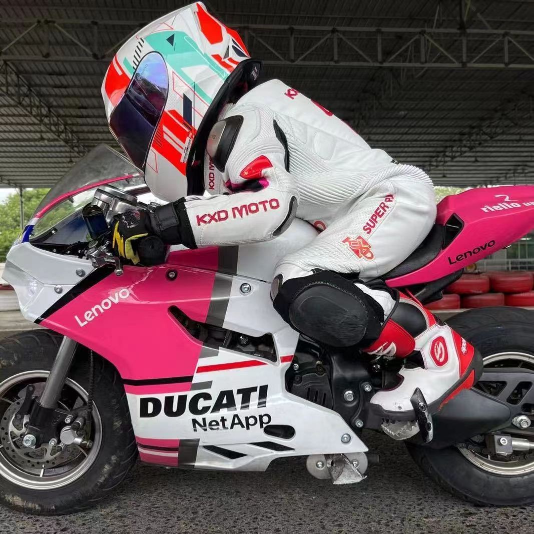 小女孩骑着粉色摩托车在赛道上驰骋,随着弯道方向左右控制重心,快速压弯通过。