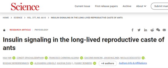 [1] Hua Yan et al., (2022) Insulin signaling in the long-lived reproductive caste of ants. Science Doi: 10.1126/science.abm8767