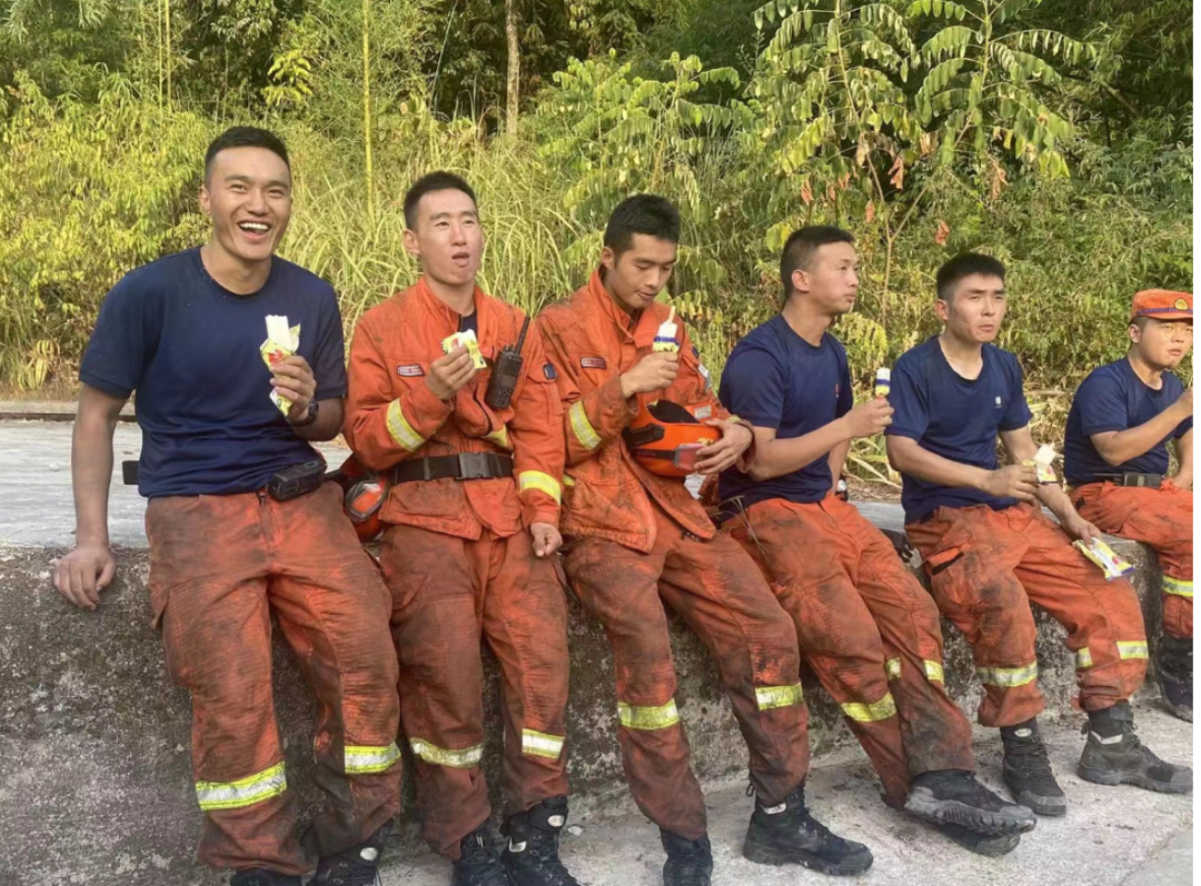 消防员吃着当地志愿者送来的冰糕、喝着冰水