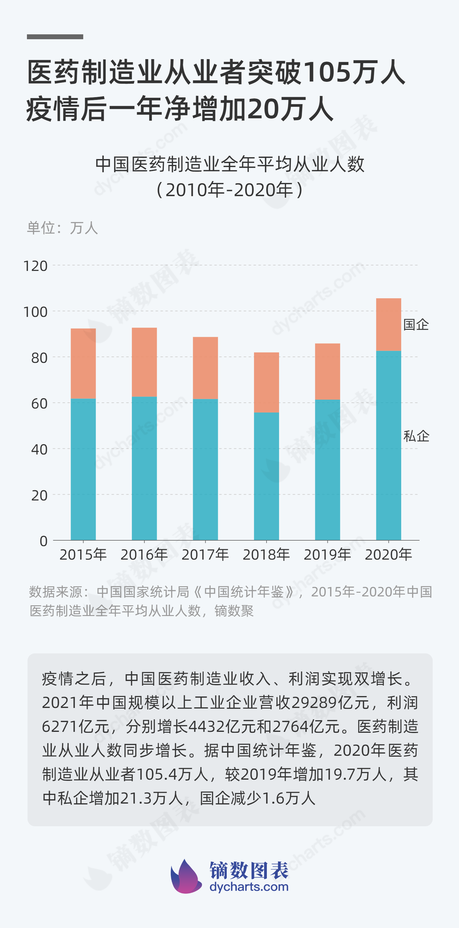 2021年中国规模以上工业企业营收29289亿元,利润6271亿元,分别增长4432亿元和2764亿元。医药制造业从业人数同步增长。据中国统计年鉴,2020年医药制造业从业者105.4万人,较2019年增加19.7万人,其中私企增加21.3万人,国企减少1.6万人。