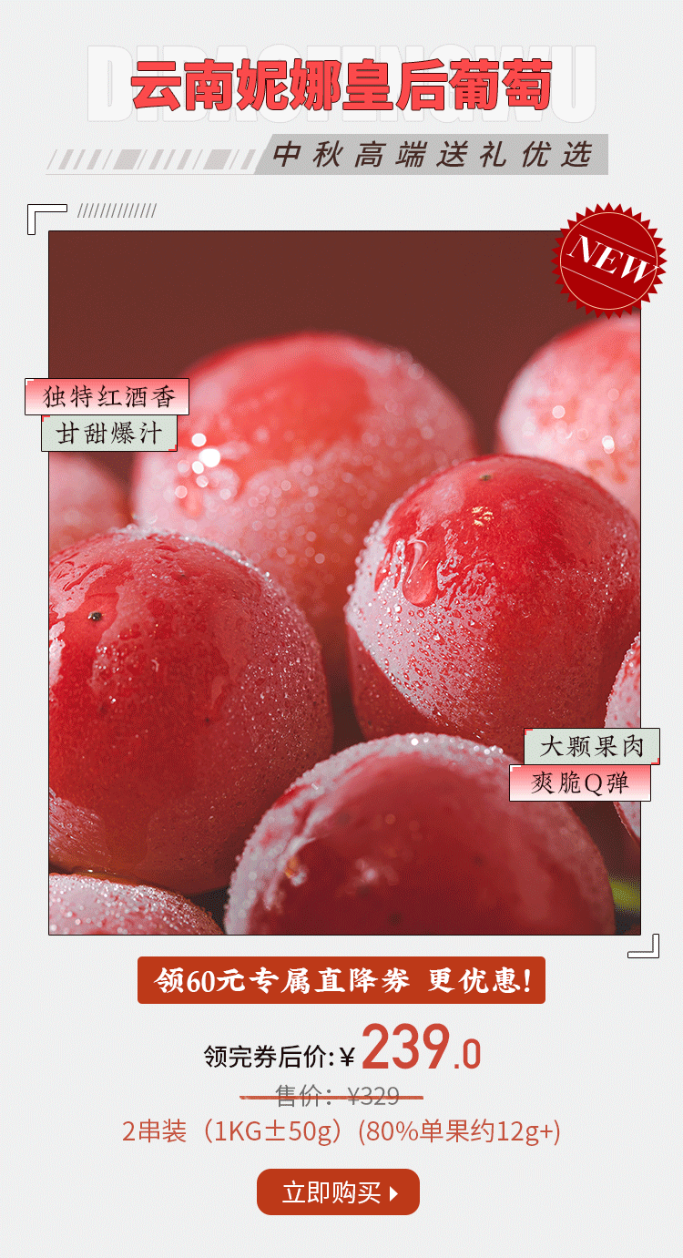 为让大家有更好的尝鲜机会,目前妮娜皇后还有限时直降60元优惠活动,下单自动减免。每串葡萄都是完整发货,不拼串,气柱加冰袋加保温袋,层层保护娇贵葡萄,顺丰空运,安心到家。这次的数量不多,大家先到先得!