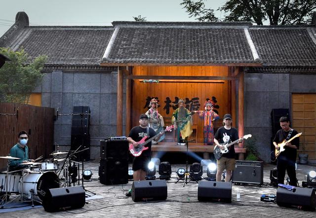 怀梆剧团成员和摇滚乐队成员在大南坡村表演(7月31日摄)。新华社记者李安摄