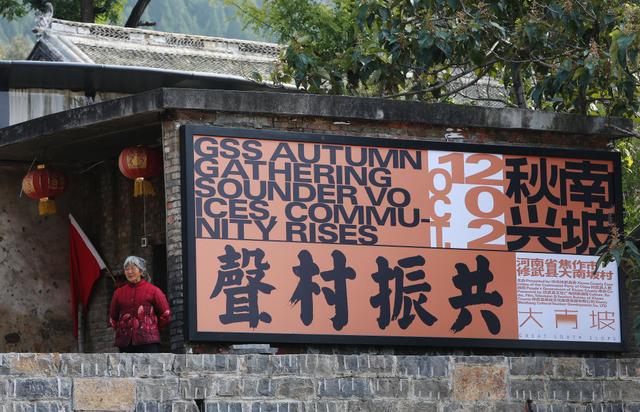在大南坡村艺术中心广场附近,一名村民站在2021南坡秋兴活动海报板旁(2021年10月21日摄)。新华社记者许雅楠摄