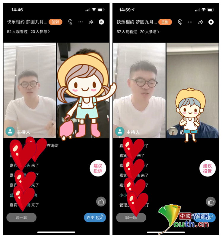本次活动在“青春有约”APP上开展直播,活动连线持续近1个小时,气氛温馨而热烈。活动中,通过“爱情大考验”“游戏猜猜猜”“像TA提问”等一系列互动性强的游戏,为青年们营造了轻松、浪漫和温馨的交流氛围,在游戏中大家相互协作、积极互动,加深了解、增进友谊。