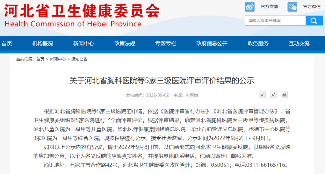 根据河北省胸科医院等5家三级医院的申请,依据《医院评审暂行办法》《河北省医院评审管理办法》,省卫生健康委组织对5家医院进行了全面评审评价。根据评审结果,确定河北省胸科医院为三级甲等传染病医院,河北省儿童医院为三级甲等儿童医院,华北医疗健康集团峰峰总医院、华北石油管理局总医院、承德市中心医院等3家医院为三级甲等综合医院。现按程序进行公示,接受社会监督,公示时间为2022年9月2日-9月8日。