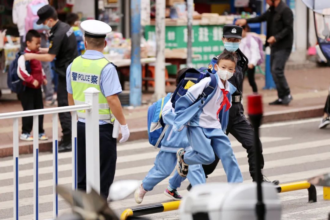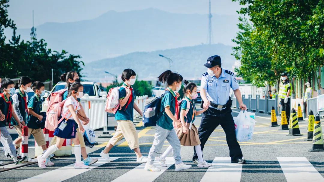 9月1日,山东省威海市公安局环翠分局“护学岗”民警带领学生安全通过路口。孔少杰 摄