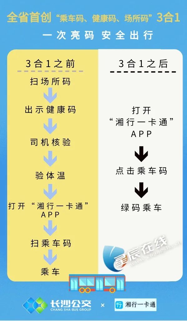 (自9月1日起,长沙公交集团湘行一卡通APP已实现乘车码与健康码、场所码的对接,在全省首创“三码合一”,实现了“一次亮码,安全出行”。)