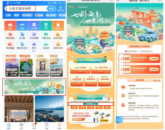 云南省文化和旅游厅联合中石油、中石化两家油企,通过“游云南”“携程”“同程”三家线上平台,于9月5日至10月15日发放第三批次4000万文旅加油券。每份加油券总额100元。