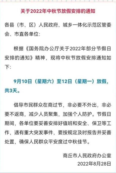 在河南商丘,商丘市政府在中秋放假通知中也提到,“倡导市民群众在商过节,非必要不外出,非必要不返商”。