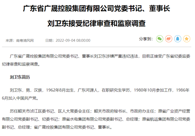9月4日上午,广东省纪委监委发布通报,广东省广晟控股集团有限公司党委书记、董事长刘卫东涉嫌严重违纪违法,目前正接受广东省纪委监委纪律审查和监察调查。