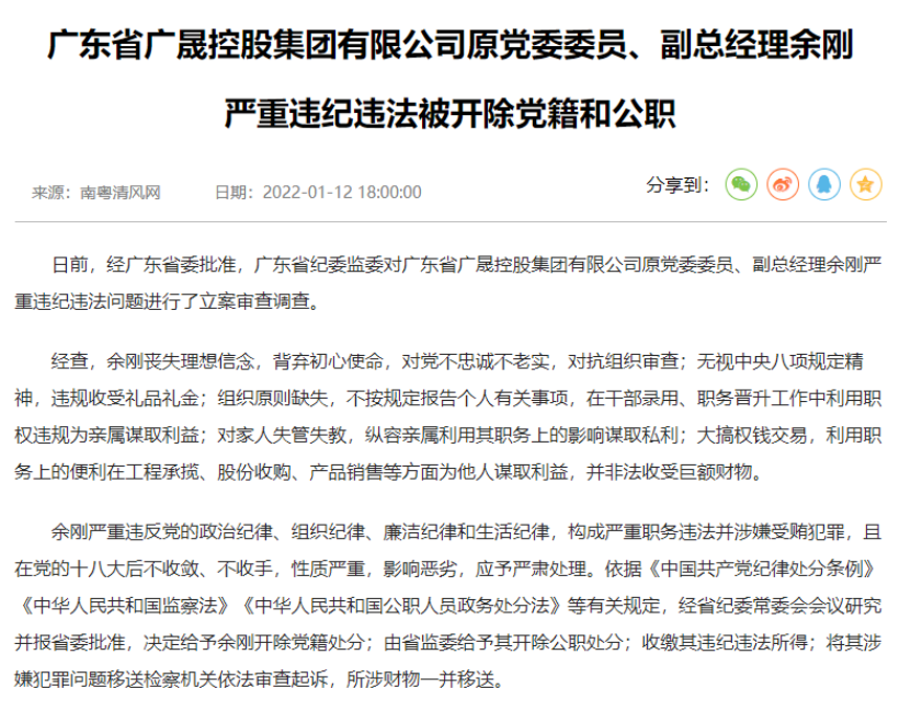 今年1月份,广晟集团原党委委员、副总经理余刚严重违纪违法,被开除党籍和公职。