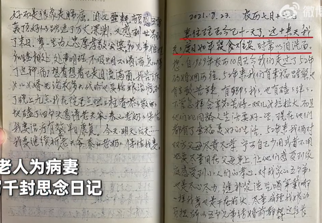 在日记里,郭爷爷记录了自己和妻子平时相处的日常,“有幸福甜蜜,也有辛酸苦辣,有卿卿我我,也有磕磕绊绊”。得知妻子患病之后,他告诉女儿女婿“无论花多大代价也要给娘治疗”。