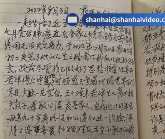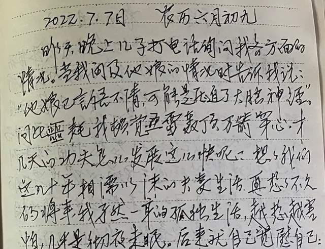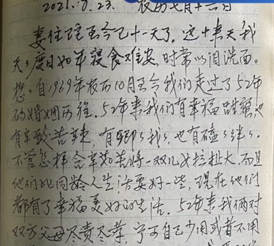 郭先生说,去年8月,他的奶奶确诊小细胞肺癌,子女带老人出门看病时,郭先生的爷爷在家也会总想着这件事。2021年8月23日,郭爷爷在日记写道:“妻住院至今已十一天了,这十来天我天天度日如年,寝食难安,时常以泪洗面。”
