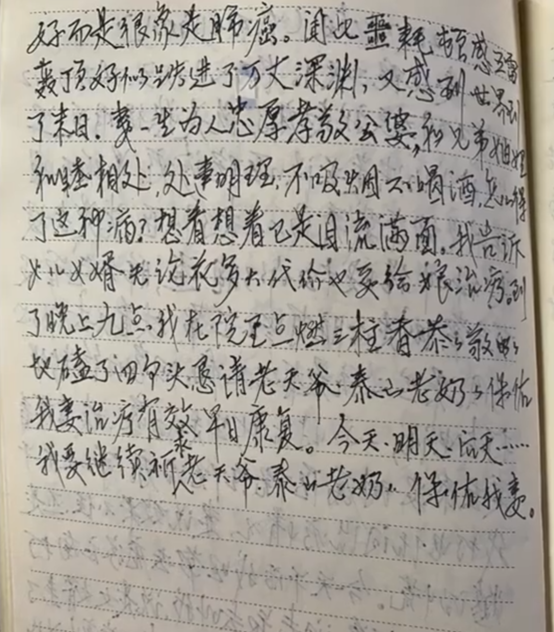 “到了晚上九点,我在院里点燃三柱香,恭恭敬敬地磕了四个头,恳请老天爷、泰山老奶奶保佑我妻治疗有效,早日康复。今天、明天、后天……我要继续祈求老天爷、泰山老奶奶,保佑我妻。”郭爷爷写道。