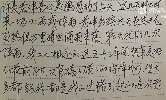 在郭爷爷的妻子去世后,他写道:“许是老伴善心美德感动了上天,这几天时不时来一场小雨或阵雨,老伴出殡这天虽然天气炎热,但万里晴空滴雨未落,第二天就下了几次阵雨。”