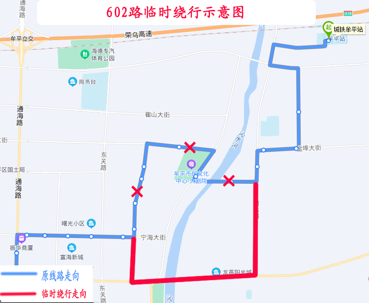 由城铁牟平站发车,沿原线路行至隆达路与天华街交叉口直行,沿隆达路、北关大街、师范路运行至师范路与宁海大街交叉口左转恢复原线路。