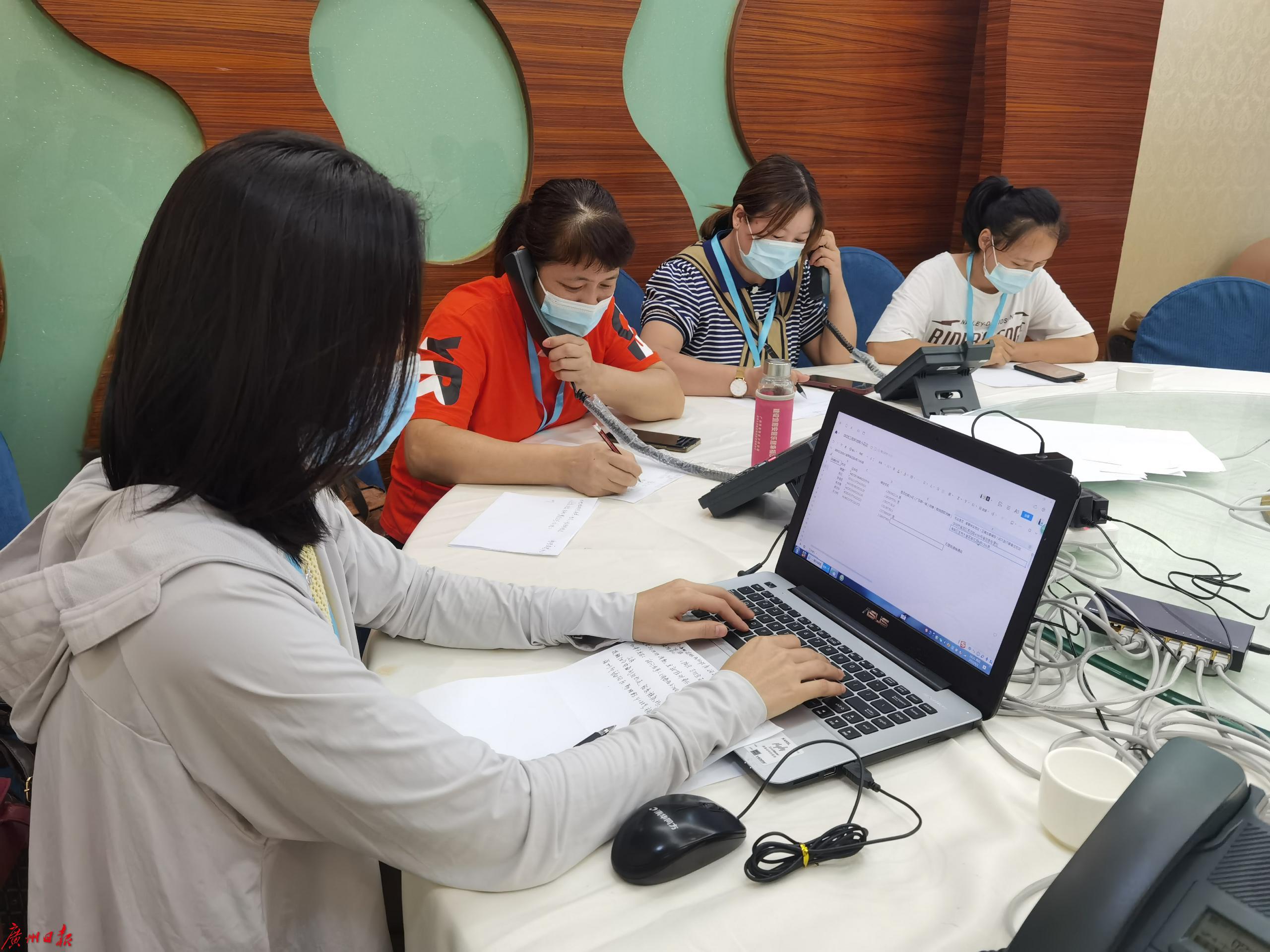 进驻华海大厦的流调队员们争分夺秒,细致高效,与时间赛跑。他们每天从早上8点工作到凌晨,守在电脑边、电话旁,每人每天要打200多个电话,每个电话费时十分钟以上:排查重点场所的密接、次密接人员的住址、同住同行人、行程轨迹等信息并做好记录与统计,为海珠区疫情防控专班精准处置疫情第一时间提供全方位的动态信息。