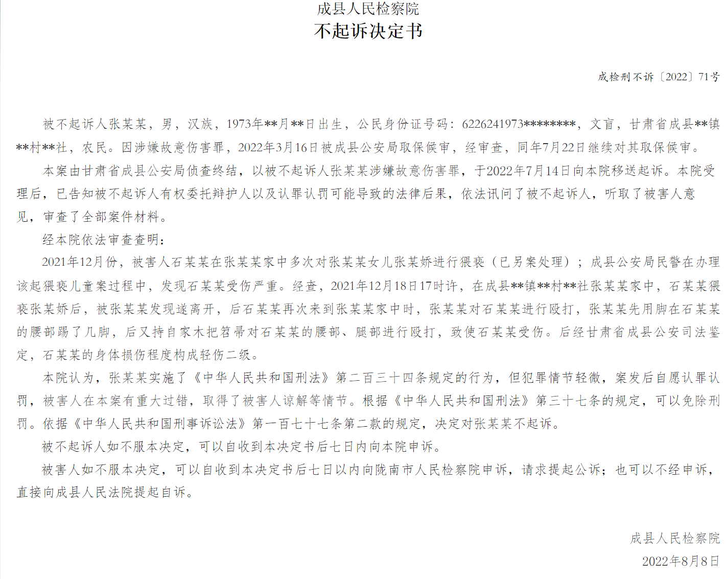 近日,中国检察网公布了一则甘肃陇南成县人民检察院的不起诉决定书:2021年12月,男子石某某多次在张某某家中对其女儿进行猥亵(已另案处理),民警发现石某某受伤严重。